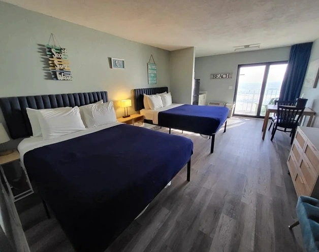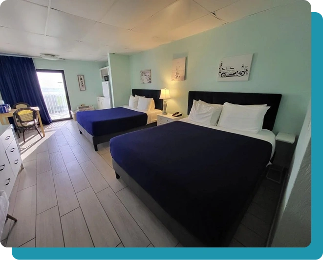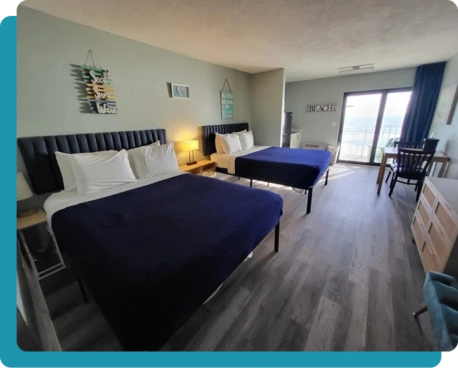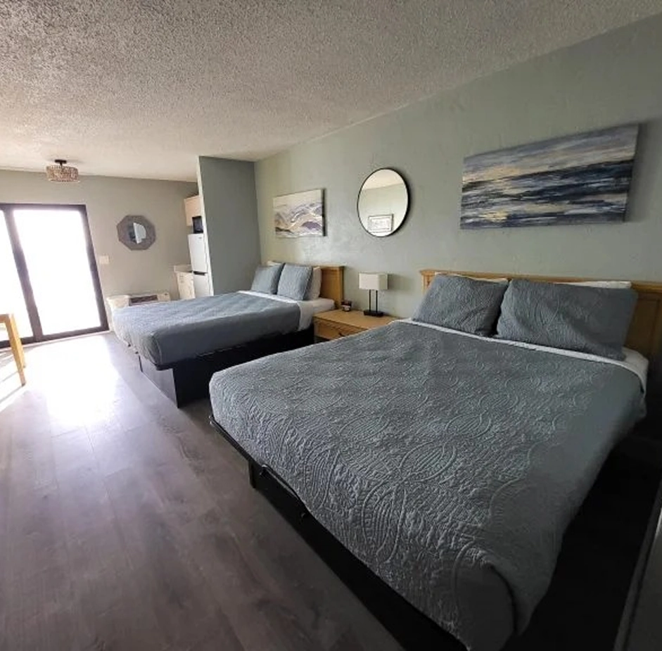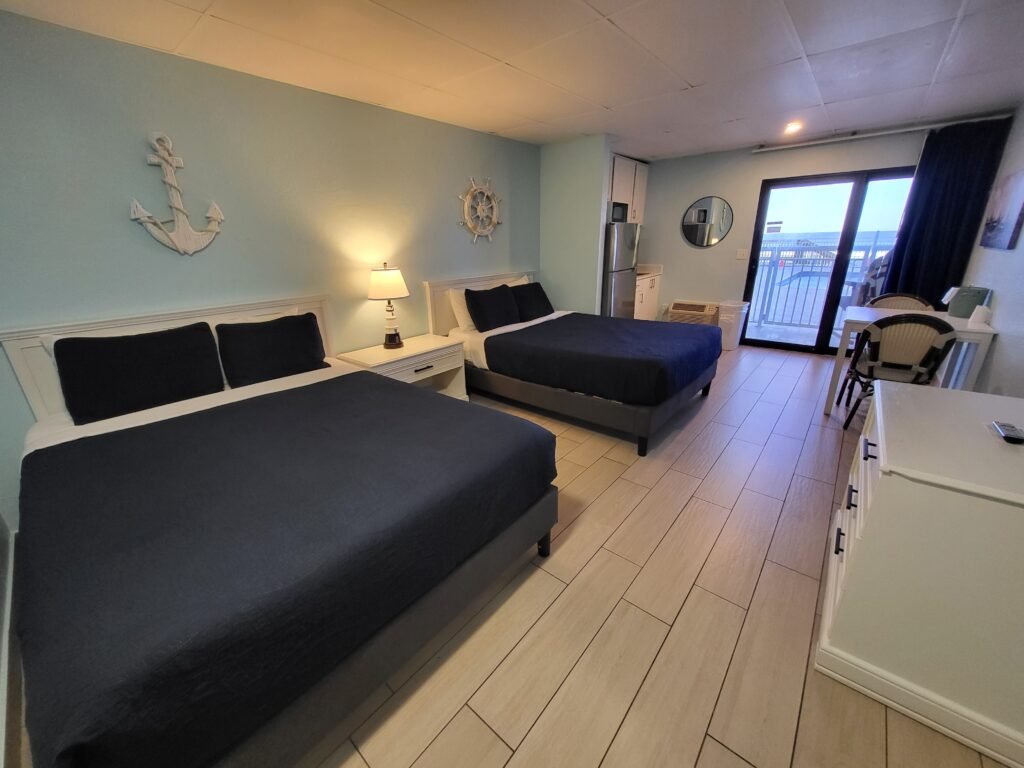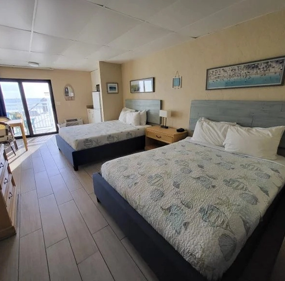There is no better way to start your day than soft salt-filled breezes combine with the sound of mellow waves to gently brings your day to life. This beautifully appointed oceanfront suite features two queen beds, kitchenette with refrigerator, cooktop, microwave, cookware, silverware, TV and balcony overlooking the Atlantic Ocean.
