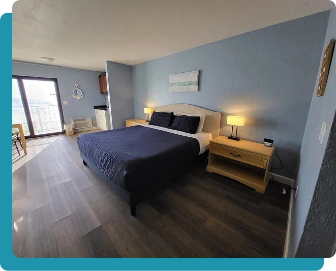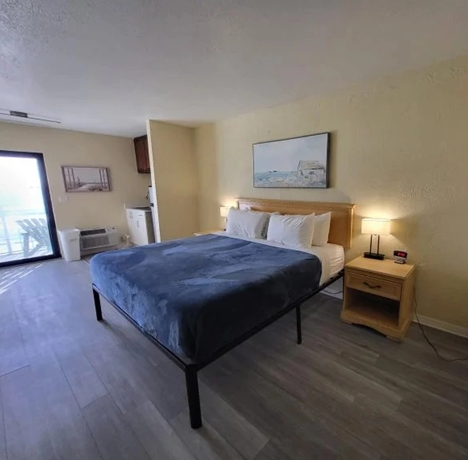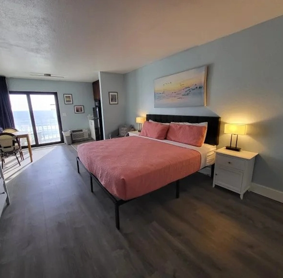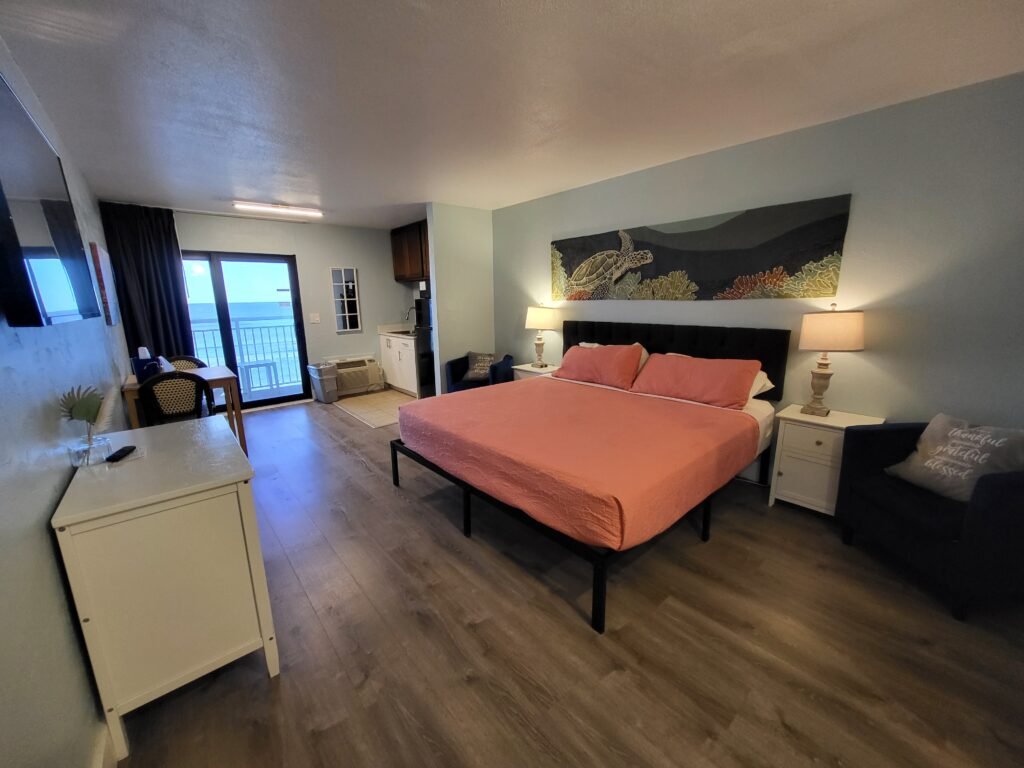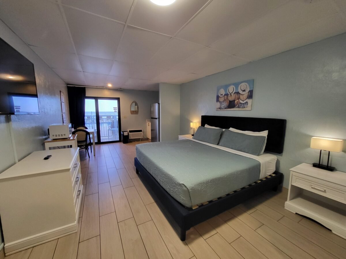 Kiss the morning hello as you are gently awakened by the sound of comforting waves and the sun slowly peeking through your oceanfront balcony. This beautifully appointed oceanfront suite features a king-size bed, kitchenette with refrigerator, cooktop, microwave, cookware, silverware, smart TV, and balcony overlooking the Atlantic Ocean.