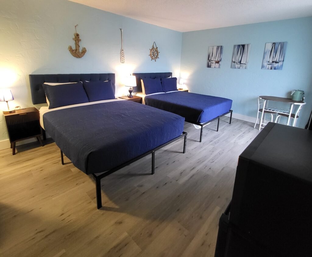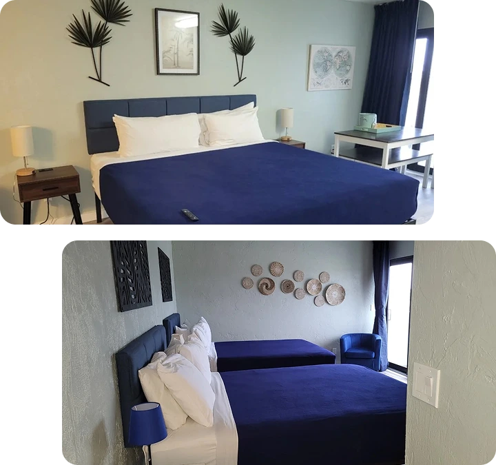 Perfect for the whole family or those traveling in larger groups who want to be close. This beautifully appointed suite provides a wonderful view of the Halifax River and offers amazing sunset views, making for the perfect end to a wonderful day. The main room is equipped with a king size bed, bathroom, kitchenette with refrigerator, cooktop, microwave, cookware, silverware, TV and balcony overlooking. The 2nd bedroom provides two double beds, bathroom, smart TV and balcony overlooking the Halifax River.